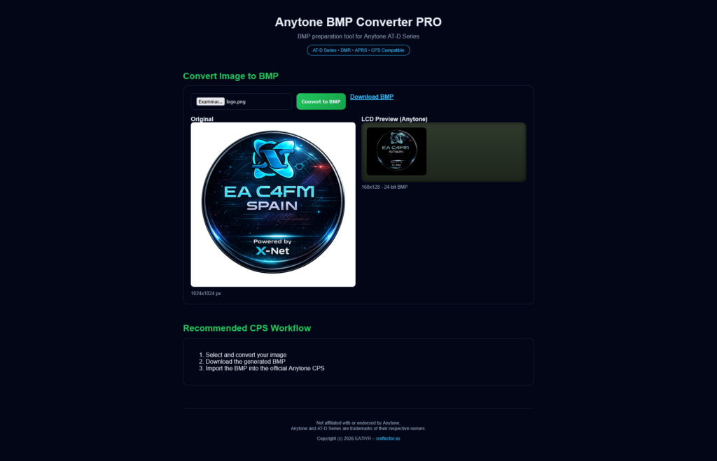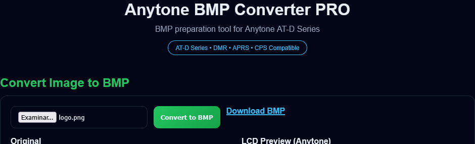 Anytone BMP Converter PRO es una herramienta web especializada para la preparación de imágenes BMP compatibles con la serie Anytone AT-D, diseñada para radioaficionados DMR y APRS que buscan precisión, seguridad y compatibilidad total con el CPS oficial.